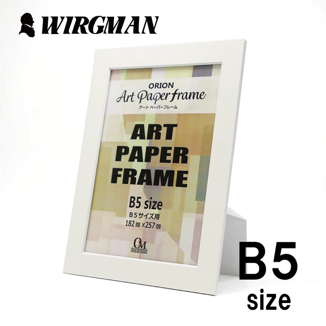 〜 今日は何を飾ろうかな ? 〜 B5サイズ(257㎜x182㎜)用 気軽に飾れる額装用マット(紙)製の額縁です。 上紙としてオリオンの水彩紙ワーグマン貼り合わせています。 自由に絵を描いたりシールを貼ったりして、自由に世界で一つだけのオリジナル額縁を作ることができます! 絵やイラストのほか、印刷した写真を飾るフォトフレームとしてもご利用いただけます。 オリオン社のアートペーパーフレームは作品保護にこだわり、表面・中芯・背面スタンドと作品に密着する部材全てに中性のオリオンホワイトマットボードを使用しています。 中性のオリオンホワイトマットボードは主に絵画の額装に使われており、酸化による作品の劣化・変色を遅らせる役割があります。 こちらの商品はB5サイズ(257㎜x182㎜)がちょうどピッタリ入るサイズ。表面には透明の保護フィルムが付いています。 裏面にスタンドと穴開け加工が施されており、縦・横置きや壁掛けでも簡単に飾れます。 サイズ展開も豊富。 この製品は、1% for Present Tree(植林プロジェクト)対象製品です。 ≪ 商品仕様 ≫ ・ サイズ:B5サイズ(257㎜x182㎜) 外寸:236㎜×311㎜ 内寸:176㎜×251㎜ ・ 付属品:高透明シート・背面スタンド・壁掛け用穴付き ・ 水彩紙ワーグマン貼り
