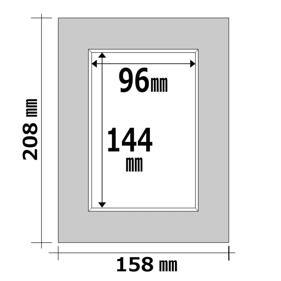 こちらの商品は、はがきサイズ(100㎜×148㎜)がちょうどピッタリ入るサイズ。表面には透明の保護フィルムが付いています。
